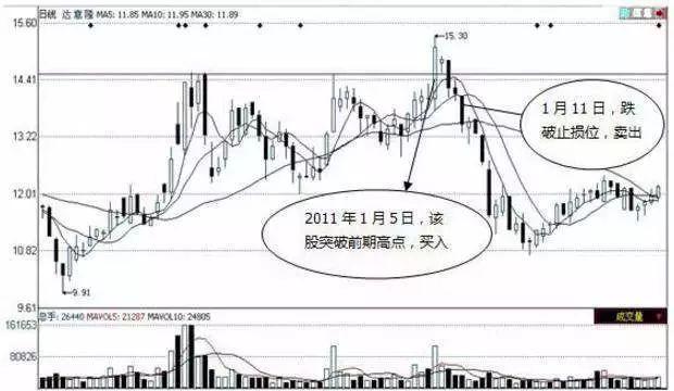 https://p6-tt.byteimg.com/origin/pgc-image/RPKQlMa9qWK4Ff?from=pc如图所示,投资者如果把达意隆选为将要买入的目标股,就需要好好选择一个买入点。2011年1月5日,该股突破了前期创下的最高点,并收下15.30元的高价,由于前两次该股股价都是拉高遇阻回调,而这次却成功实现了突破,所以,投资者这时可以选择买入该股,并把下跌8%作为止损位。一旦该股跌破这一位置,就可以卖出该股。其实,投资者也可以将前期最高点最为止损位,但由于买入价距离止损位太近,所以,最好将止损位设置的稍稍距买入价有点距离为好。