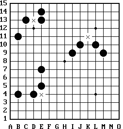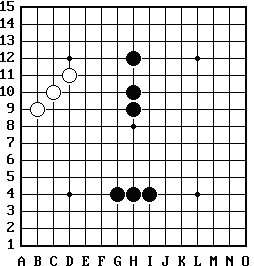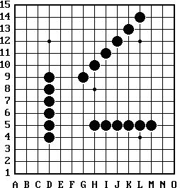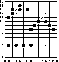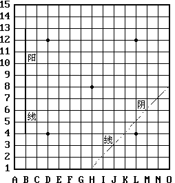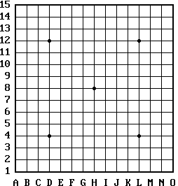 以对局开始时的黑方为准,棋盘上的纵行线从下到上用阿拉伯数字1~15标记。横行线从左到右用英文字母A~O标记。其中H8点为天元;D4、D12、L12、L4四点为星。天元和星应在棋盘上用直径约为0.5厘米的实心小圆点标出。天元和星在棋盘上起标示位置的作用,见图1。