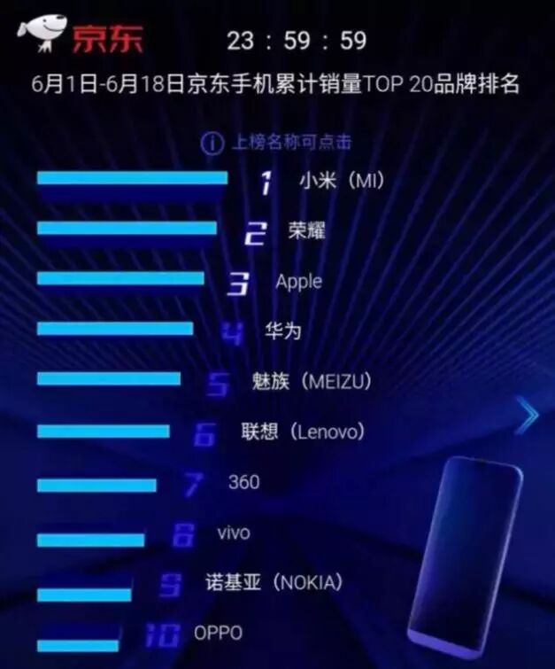 今天我们再回过头来看整件事的来龙去脉,会发现原因显而易见。在京东618当晚23点59分59秒,也就是618活动截止时间,从京东给出的618活动手机销量排行榜可以看出,小米位列排行榜第一,紧随其后的是荣耀。
