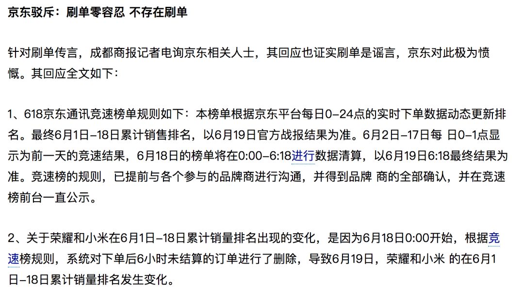 在6月21日,作为东道主的京东也正面回应了此事。京东表示618累计销售排名以6月19日官方战报为准。删除6月19日0:00-6:18未结算的订单后,小米手机从第一名变至第二名。