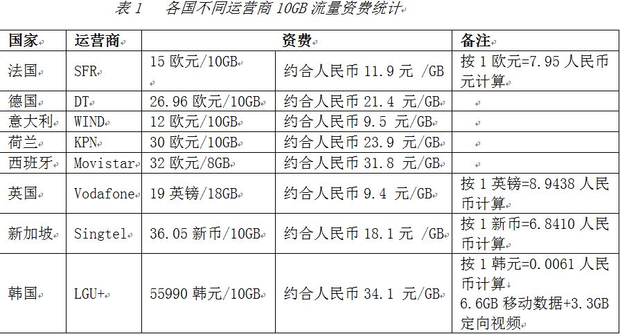 对比发现,我国三大运营商资费在6.8~8元/GB之间,而表1中资费最低的英国和意大利均高于9元。