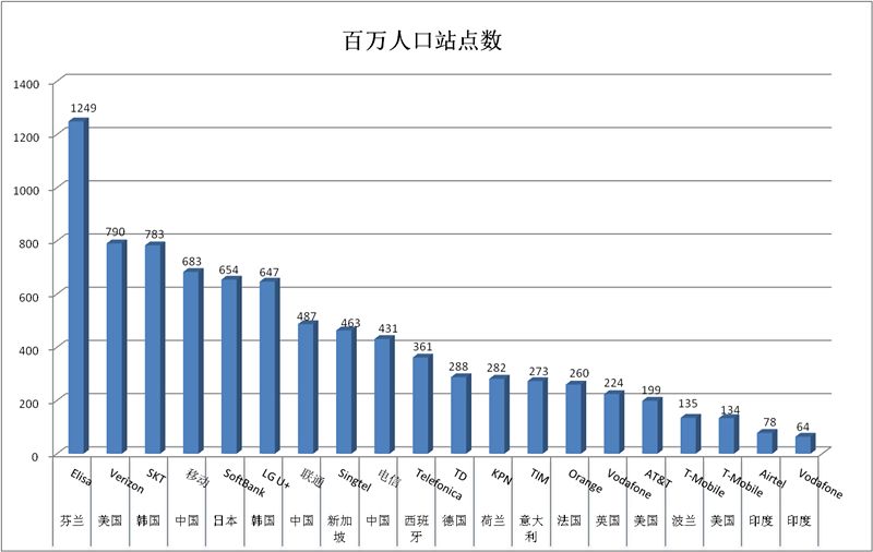 如果以每百万人口对应LTE基站数来衡量各国运营商在覆盖上的投入情况,我国远高于全球大部分国家的多数运营商。其中,中国移动以683位居第四,仅落后于芬兰Elisa、美国Verizon、韩国SKT。