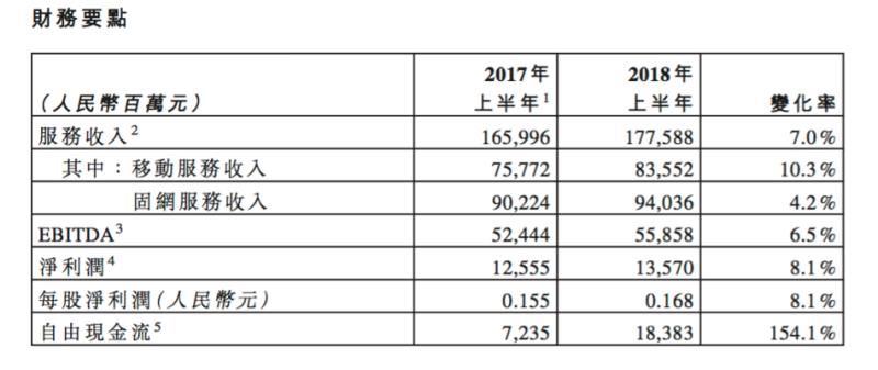 2018年上半年,中国电信经营收入达到1930.29亿元,比去年同期上升4.7%;服务收入为1775.88亿元,比去年同期上升7.0%。EBITDA为558.58亿元,比去年同期上升6.5%,EBITDA率为31.5%。公司股东应占利润达到135.70亿元,比去年同期上升8.1%,每股基本净利润为人民币0.168元。