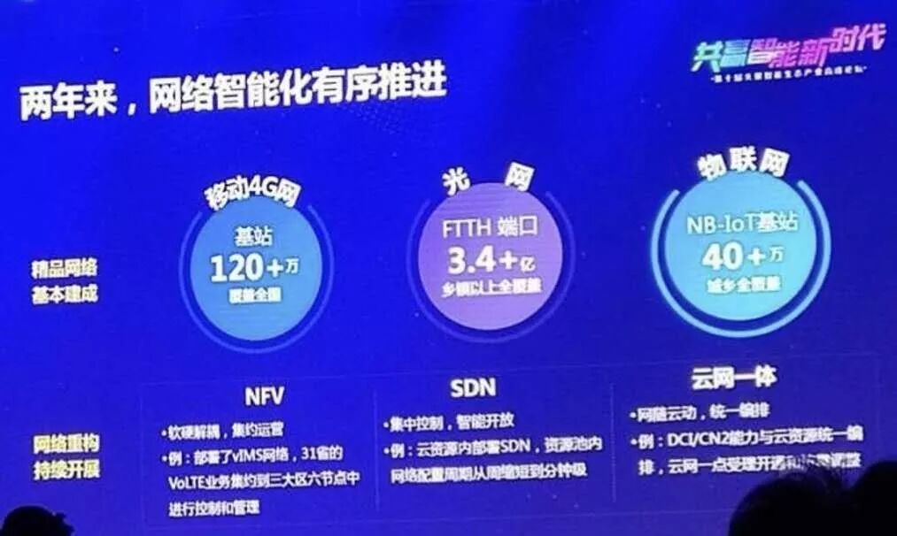 两年来,网络智能化有序推进。2016年,中国电信启动了CTNet 2025网络重构计划,推动网络智能化演进。目前,中国电信的移动4G网、光纤宽带网和物联网等“三张精品网”已基本建成。同时,在引入SDN、NFV、云网一体等新技术推进网络重构方面也取得了阶段性成效,如在主要的云资源池部署了SDN,资源池内的网络配置周期已从周缩短到分钟级。