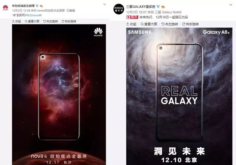 近日,“挖孔屏”成手机行业新热点。先是华为官方宣布在12月将发布一款新机搭载“自拍极点全面屏”,并在12月3日宣布这款手机将被命名为华为nova 4,将于12月17日在长沙发布。紧接着,12月3日晚上三星也通过官方微博直接爆出12月10日将发布Galaxy A8s,也采用了“挖孔屏”。