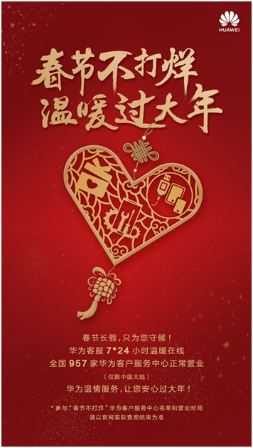 放眼现在,华为推出的“春节不打烊”活动,让中国消费者在传统新春佳节依然能够感受到华为品牌的温度,也让华为品牌贴心的服务以及高品质的产品,伴随消费者度过一个更具意义的春节假期。