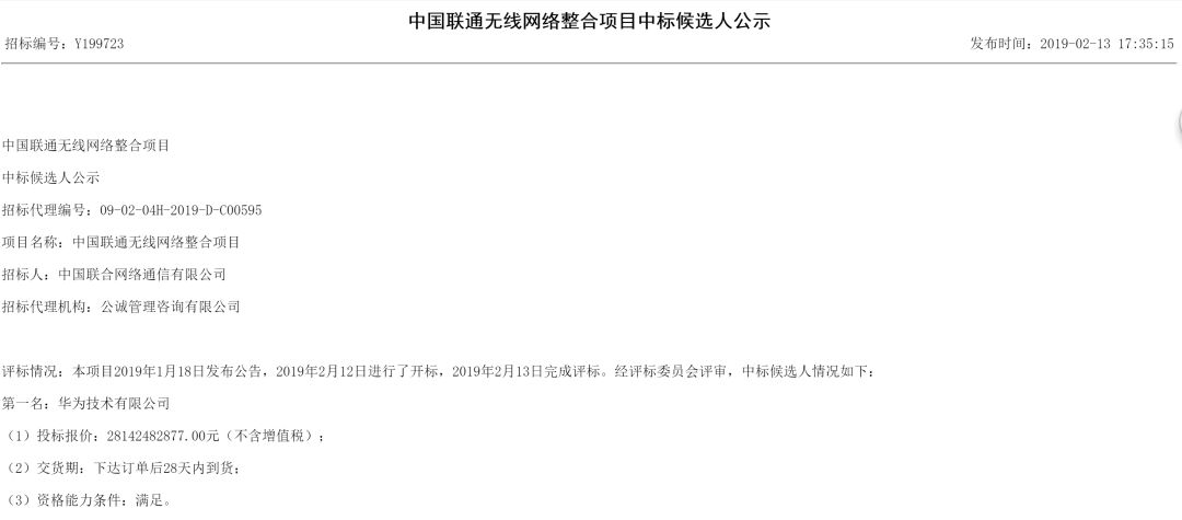 2019年2月13日下午,备受瞩目的中国联通41.6万站无线网络整合项目启动公示。中国联通采购与招标网公告信息显示,本次招标涉及L900及L1800基站41.6万站、L1800整合、软件功能等,是5G商用之前国内最大规模的招标项目。