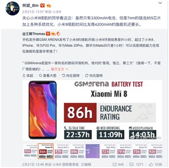 2月21日,小米公司产品总监@王腾Thomas发文称:“小米9评测结果是91小时,超过了小米8、IPhone、华为P20 Pro、华为Mate 20Pro,跟华为Mate20只差1小时!”