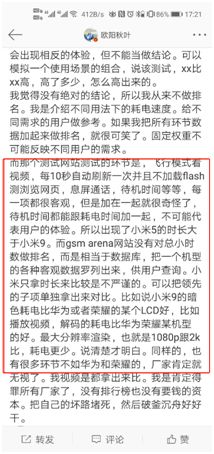 其次,对手机续航测评比较了解的大V,在电池门事件爆发后,也对手机续航测评进行了科普。该大V直接指出,在手机测评环节中,飞行模式看视频,每十秒刷新一次且不加载flash测浏览网页,息屏通话,待机时间,这些测试时间加在一起便是手机最后的续航测评时间。