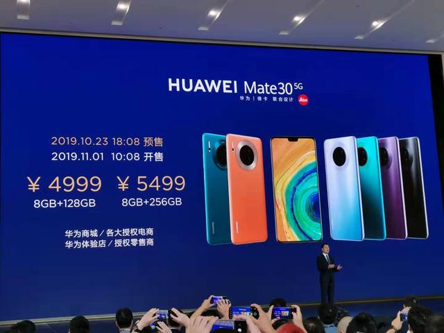 10月23日,华为还重磅发布Mate30系列5G版本手机,售价4999元起,包括Mate30