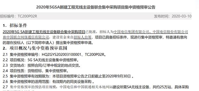3月10日,中国电信与中国联通分别发布内容相同的“2020年5G SA新建工程无线主设备联合集中采购项目集中资格预审公告”。