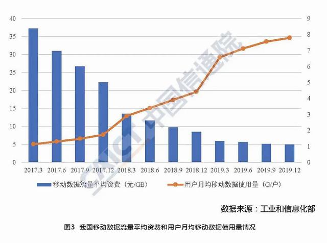 2019年第四季度,我国移动数据流量平均资费为5元/GB,同比下降了41.2%,用户月均移动数据使用量为7.79GB,同比增长76.2%,移动通信月户均支出为46.8元,同比略降7.5%。港澳流量漫游平均资费为0.11元/MB,较2018年的0.17元/MB下降了32.4%。
