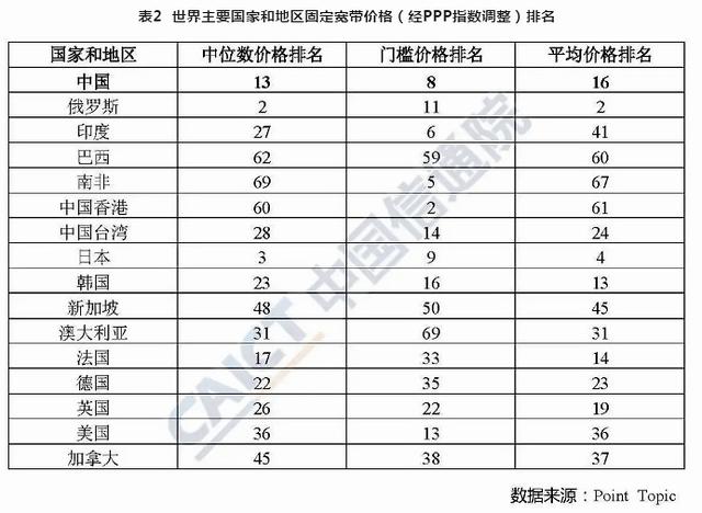 综合各类型宽带[2],按PPP指数价格水平从低到高排名,我国固定宽带平均价格、门槛价格和固定宽带产品中位数价格分别位于第16位、第8位和第13位,在全球84个国家中处于较低水平。