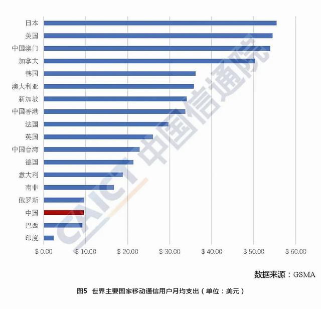 2019年第四季度,我国移动通信资费在全球处于偏低水平,移动通信用户月均支出在全部239个国家和地区中按价格由低至高排名第79位[3],低于全球13.56美元的平均水平,远低于日本、美国、加拿大、韩国等发达国家。