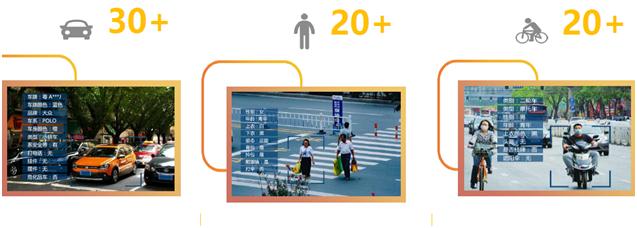 系统支持30余种车辆属性的识别,包含车牌、车牌类型、车牌颜色、车辆品牌、车身颜色等,20余种骑行属性的识别,如性别、年龄段、是否戴头盔、骑行车类别等,20余种行人属性的识别,包含性别、年龄段、衣饰、姿态、方向等。