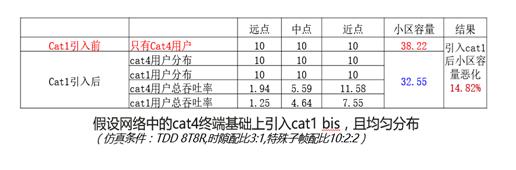 再看下运营商网络的情况,当前LTE网络中的物联网终端基本上都为Cat.4终端,在Cat.1终端接入后,假设两者数量一致,会对LTE现网容量带来怎样的变化,如下为一些仿真的结果。