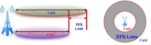 通过计算,相比Cat.4双天线接收,Cat.1/Cat.1 bis接收灵敏度小3dB,下行覆盖距离损失18%,覆盖面积损失33%。在当前LTE网络未针对Cat.1做优化的情况下,Cat.1单天线终端在LTE小区边缘是否会出现接入困难、掉网等现象呢?