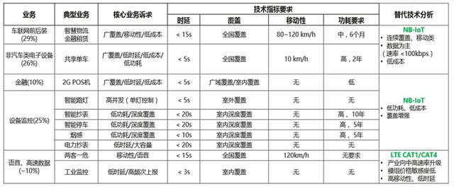 从上表中可以看出,2G重点承载的Top业务从共享单车、物流监控、POS机以及设备监控类,均不需要语音支持,数据交互的频度也不高,这部分完全可以由NB-IoT来承载。只有语音类、高频度传输类业务如“两客一危类”业务,超出了NB-IoT的能力范围,但这类业务也只占到了2G承载业务量的10%左右。