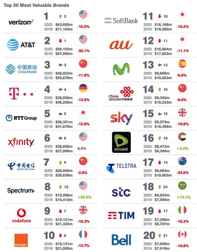 全球运营商品牌价值20强:Verizon、ATT、中国移动排前三