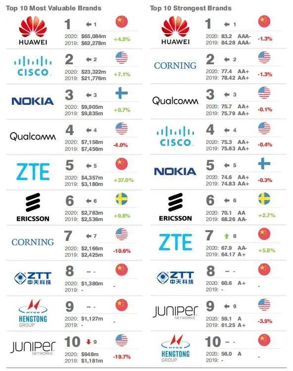 此外,《Telecoms150 2020》年度报告列出了全球十大最有价值和十大最强大的电信基础设施品牌,华为、中兴通讯、中天科技、亨通等4家中国企业入选。