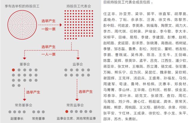 华为拥有完善的内部治理架构。持股员工选举产生115名持股员工代表,持股员工代表会选举产生董事长和16名董事,董事会选举产生4名副董事长和3名常务董事,轮值董事长由3名副董事长担任。