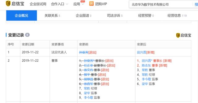同时,孙亚芳卸任法定代表人,由田兴普接任,后者为华为北京研发所所长。此外,包括华为轮值董事长郭平、徐直军、胡厚崑等在内的多名华为集团高管全部退出该子公司董事会,新增董庆阳、陈志东、彭中阳为主要人员。