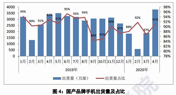 由于疫情影响,国产手机开始注重国内市场销售。本次,中国信通院还发布了国产品牌在国内出货量占比。