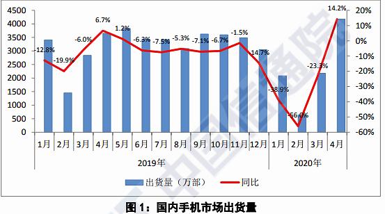 2月份手机出货量同比下降56%,3月份手机出货量同比下降23.3%,4月份手机出货量同比变为正数,增长14.2%。