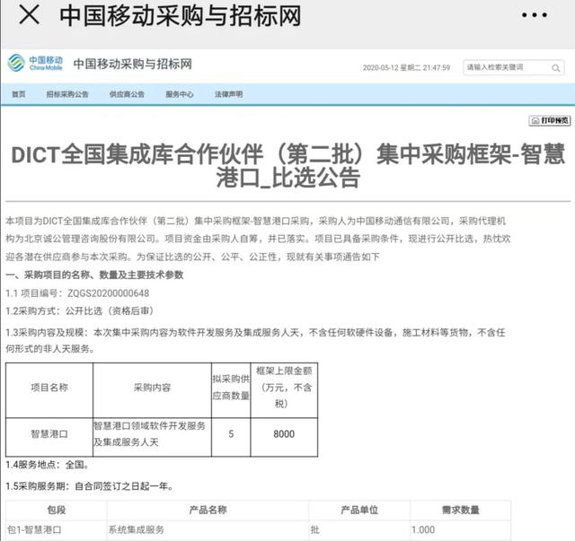 该网站信息显示,中国移动本次招标为DICT全国集成库合作伙伴(第二批)集中采购框架-智慧港口采购。从信息来看,中国移动采购内容为软件开发服务及集成服务,不含任何软硬件设备、施工材料等货物,不含任何形式的非人天服务。本次采购数量为5,框架采购金额为8000万元人民币。