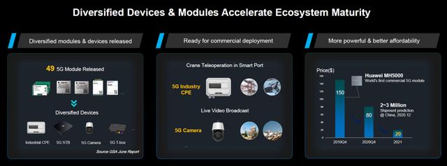面向个人客户,5G手机非常重要。当前,5G手机发展非常迅速,价格已经降低到1500元,数量极为丰富。面向行业应用,5G模组非常重要。