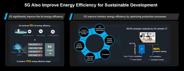 彭红华表示,5G是也有助于提升行业能效,推动节能减排,支持社会可持续发展。一方面,5G模块与4G模块能耗相当,但容量相比4G提升50倍,带来50倍Bit能效提升。另一方面,5G+行业帮助优化各行业生产流程,提升能源利用效率。