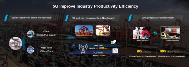 以智能港口为例,5G大带宽和低时延能力实现港口龙门吊远程操控。传统港口,龙门吊需要现场操作,单人只能同时操作一台龙门吊,效率低。但基于5G远程操控,单人可以同时操控4台龙门吊,节省70%人力成本;每小时货物处理量,从25箱提升到30箱。