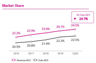 5G用户渗透率可以看出LG U+的5G增速之快。据悉,LG U+的5G手机用户渗透率达到15.9%,领先于其他两家竞争对手。5G用户的快速增长,让LG U+的5G市场份额达到24.7%。而在LTE时代,LG U+市场份额只有20%。
