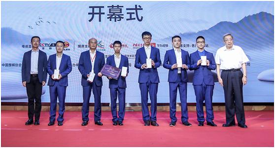 中国围棋协会主席林建超、华为消费者业务大中华区副总裁贺磊为冠军颁奖合影
