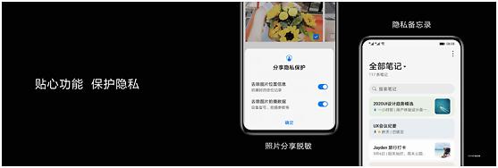 EMUI 11在隐私安全方面,还增加了照片分享脱敏和隐私备忘录。照片分享脱敏功能,用户通过华为分享发送给朋友照片时,可以选将照片拍照地址、时间以及设备等信息抹去。隐私备忘录,用户可以对备忘录中的单条笔记加密,通过身份验证后才能查看内容,更好保护你的小秘密。