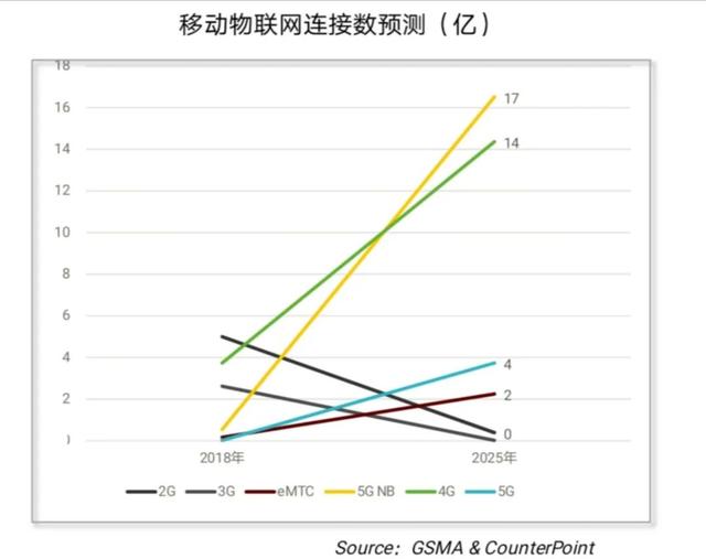 据GSMA和CounterPoint预测,在移动物联网技术发展趋势方面,5G NB-IoT、4G LTE、5G NR物联技术的连接数将快速增长。传统的2G、3G物联技术,将伴随着移动技术的迭代,及运营商退网政策的不断实施逐渐迁移到新蜂窝物联网。