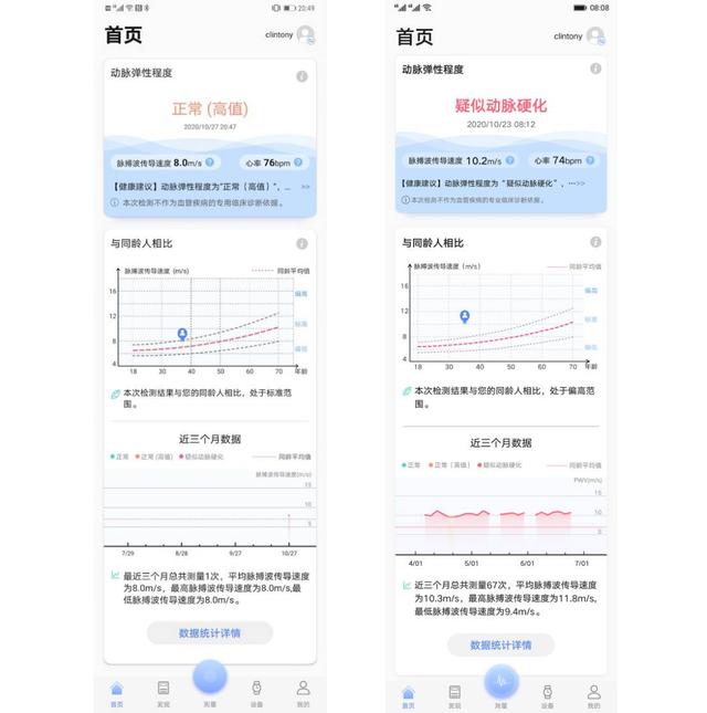 我们再看血管健康检测功能。在加入血管健康研究后,用户进入“血管健康APP”首页,点击“发起检测”即可在静止状态下,开始主动检测进行评估,获得与同龄人血管健康水平对比,并可随时查看过往历史检测数据,了解自身血管健康状况。