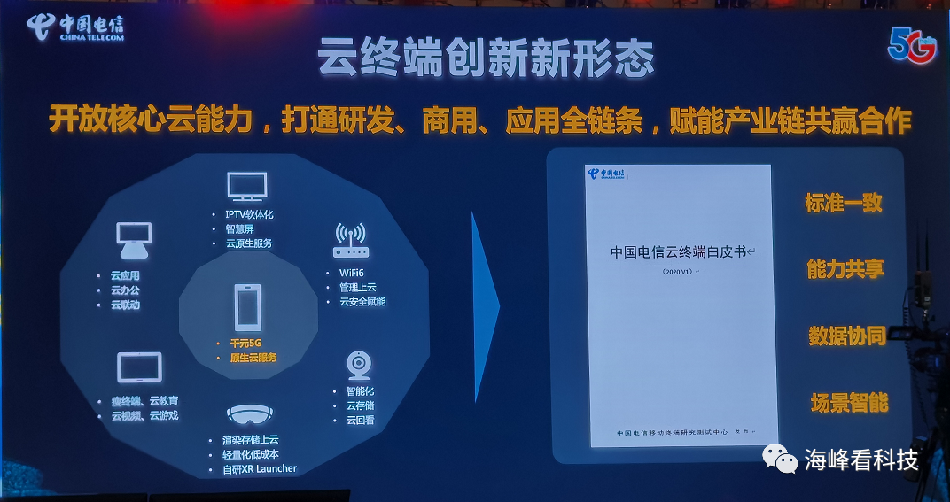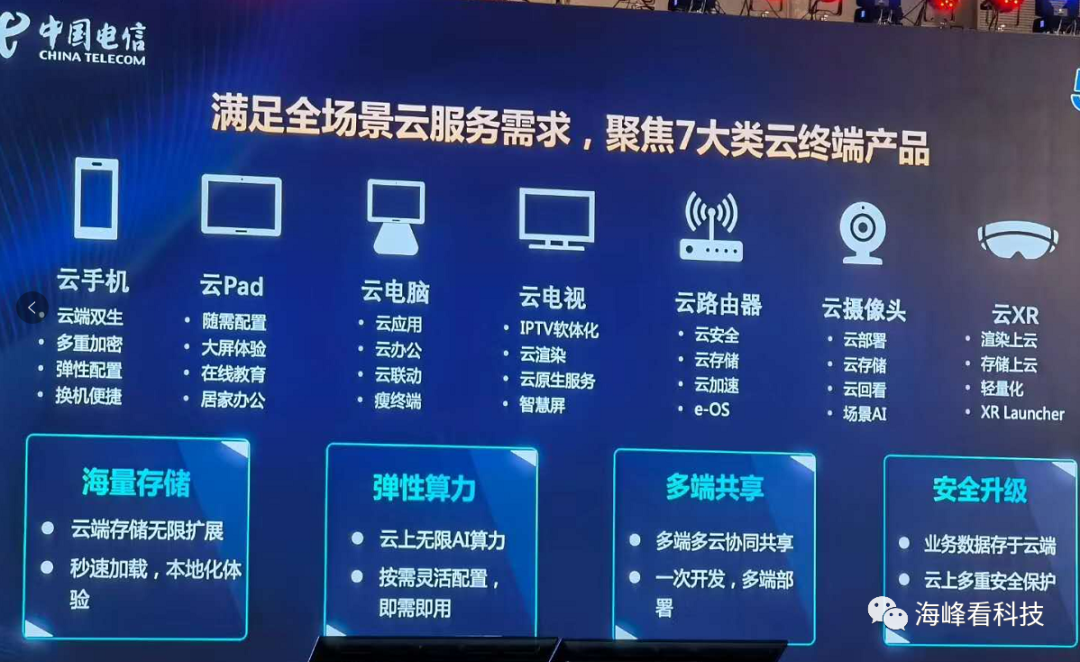 “中国电信将积极构建云终端的新生态,以千元5G原生云服务的移动云终端为核心,结合天翼高清、全屋WiFi、天翼看家、云VR等多形态、多样化的云网产品服务,积极拓展云终端能力边界。”中国电信总经理李正茂在会上说。
