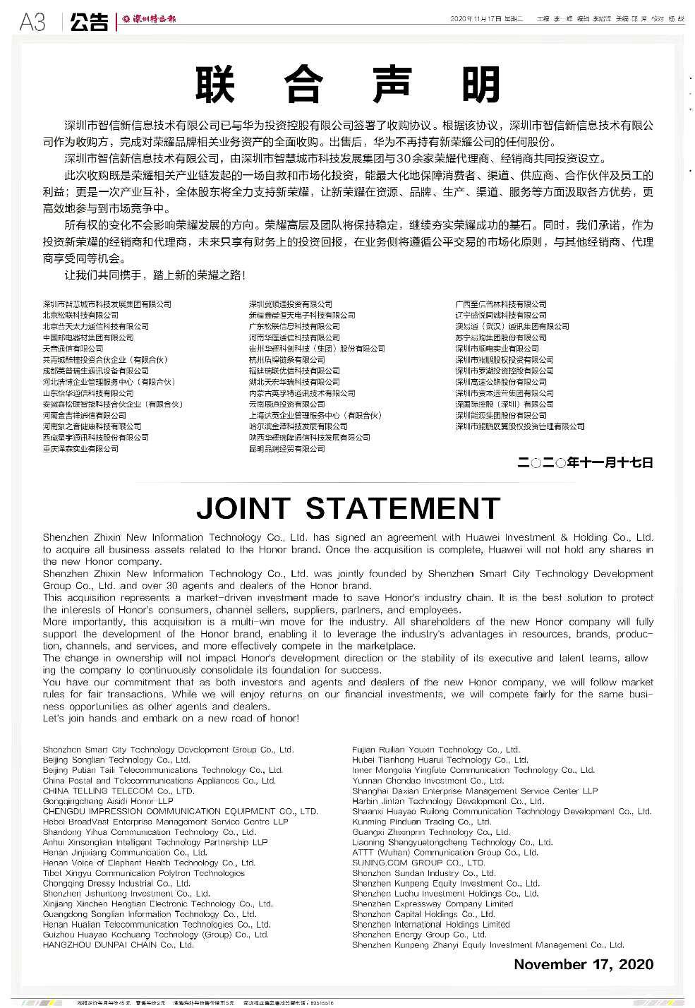 11月17日,多家企业在《深圳特区报》发布联合声明,深圳市智信新信息技术有限公司已与华为投资控股有限公司签署了收购协议,完成对荣耀品牌相关业务资产的全面收购。出售后,华为不再持有新荣耀公司的任何股份。