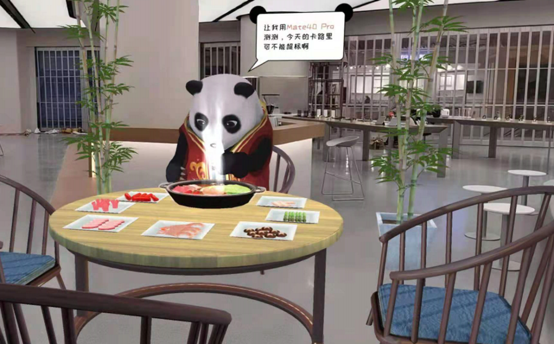 在智慧屏专区,3只熊猫在竹亭中打起四川麻将,久坐收到手表提醒,要起身用华为智慧屏AI健身。而在二楼,吃火锅的熊猫边拿出Mate 40 Pro测卡路里,等待火锅沸腾……