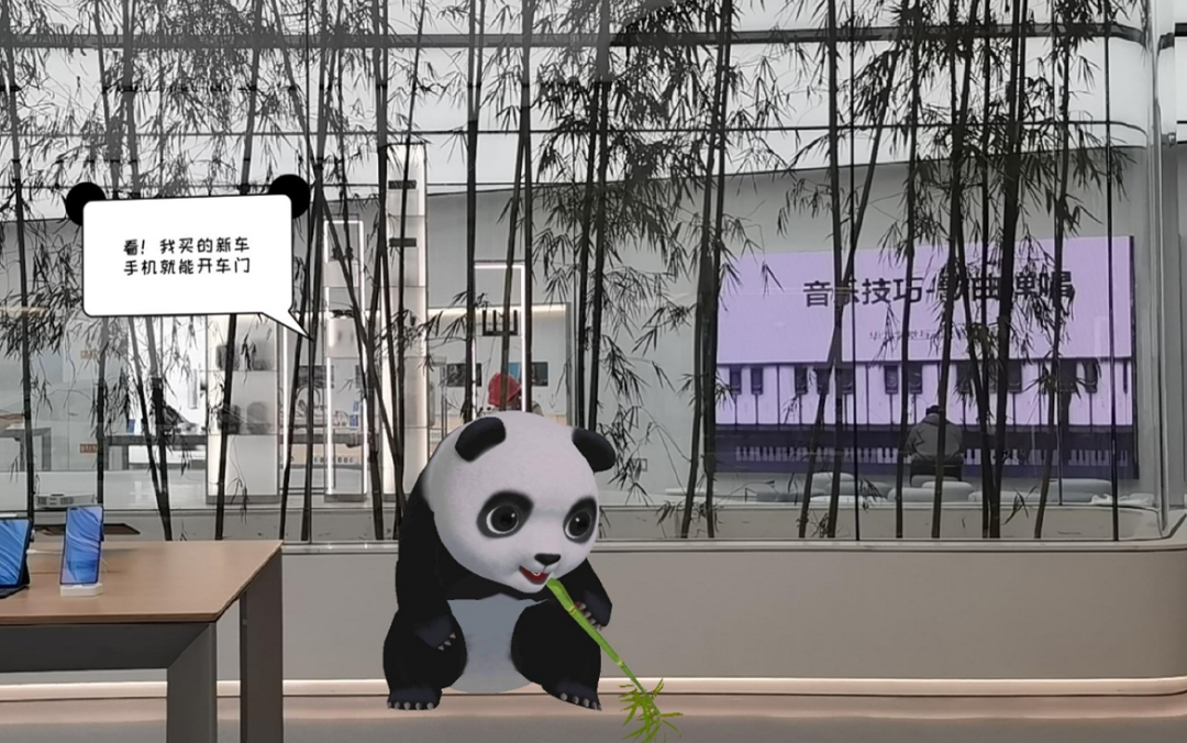 在华为学堂区,笔者看到能变脸熊猫,还有跳跃、喷火表演,招呼我用Mate40手机与它合影。在观景区,绿竹旁有只憨态可掬的熊猫,边吃竹子边介绍华为HiCar,“看!我买的新车,手机就能开车门” 。