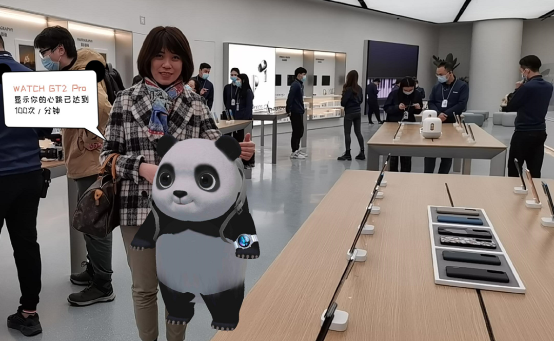 笔者在在门店扫码下载APP,扫描门店各处,就与多个“大熊猫”亲密互动。在门店外墙,一只萌萌的巨大熊猫迎接消费者进店,而入口背着华为电脑包的熊猫在打招呼,说着“这么多人来看我,太激动了”,它手上的智能手表显示出当前心率为100次/min。