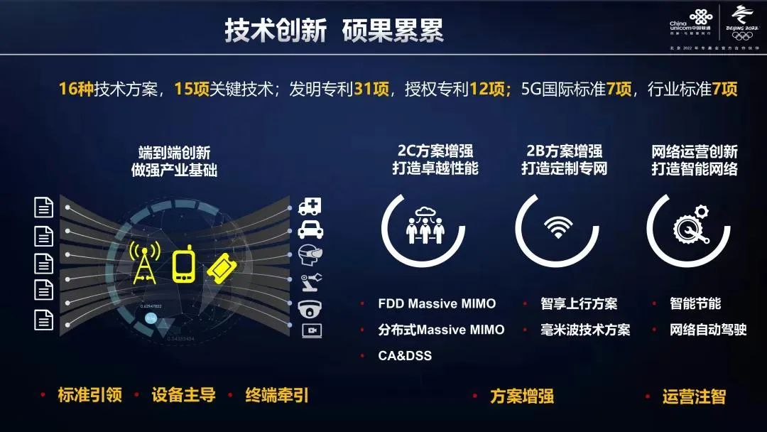 中国联通技术创新硕果累累,16种技术方案,15项关键技术;发明专利12项;5G国际标准7项,行业标准7项。