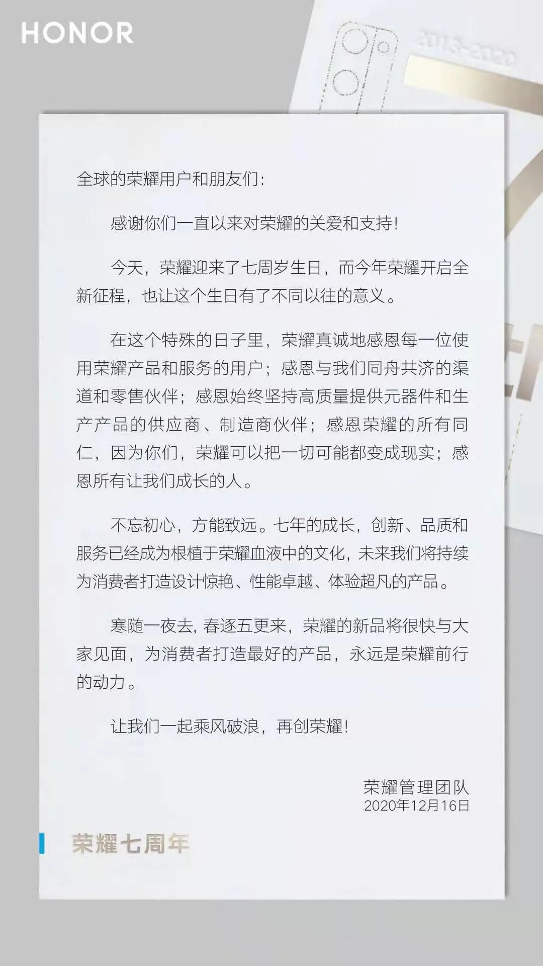其实近一个月,大家都在关注新荣耀将会怎样开展工作,笔者注意到这份七周年贺卡传递出多个信息,包括即将发布新品等,表明荣耀正踏上新征程,通过继承与改变,带给大家一个全新的荣耀。