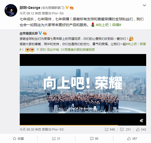 12月16日不仅是荣耀七周年纪念日,同时也是新荣耀独立后第一个周年庆。在这特殊的日子里,荣耀CEO赵明代表荣耀管理团队,在微博送出七周年寄语贺卡,感谢粉丝与合作伙伴七年来不懈的支持与陪伴,并对外传递新荣耀近期的改变以及未来新目标。