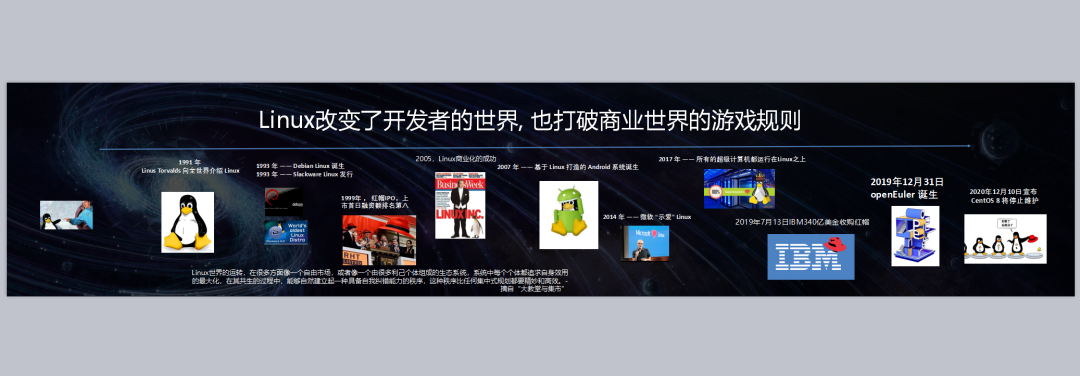 Linux从1991年出现,创造了一段段完美历史。比如2011年,谷歌推出 Chromebook;2014年,微软“示爱”Linux;2017年,所有的超级计算机都运行在Linux之上;2019年,微软为Windows10用户推出Linux。