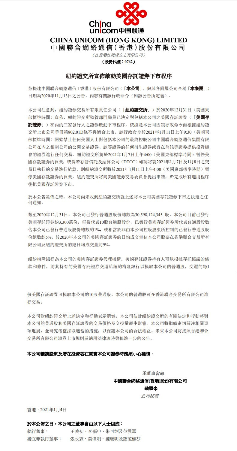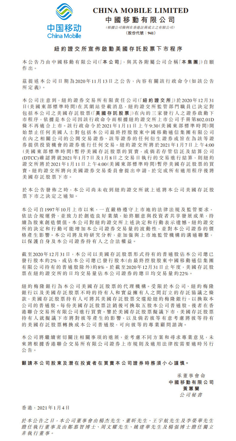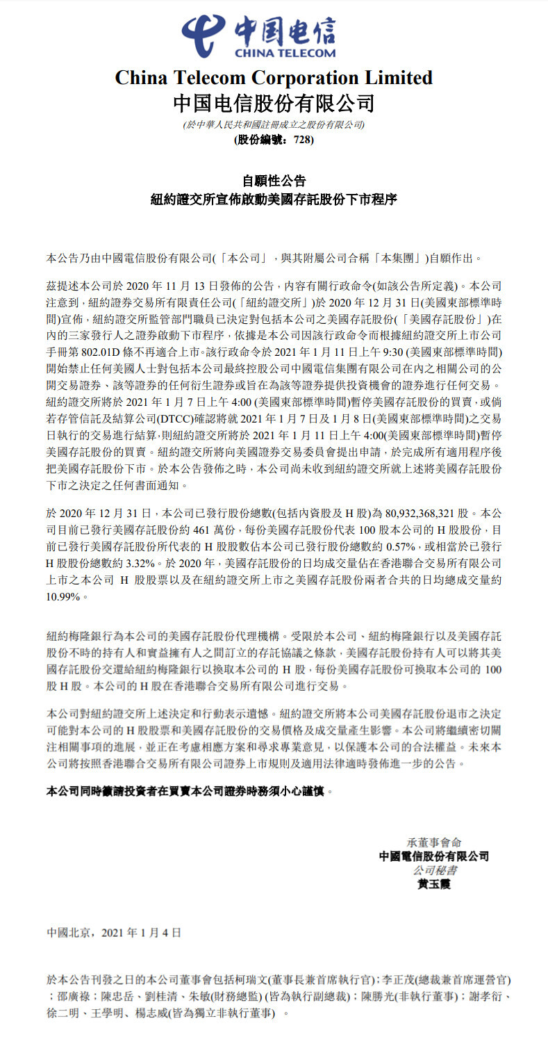 中国电信表示,纽约梅隆银行是中国电信的美国存托股份代理机构。中国电信同样称对纽交所的决定和行动“表示遗憾”,并称纽交所将中国电信美国存托股份退市的决定“可能对本公司的H股股票和美国存托股份的交易价格及成交量产生影响”。