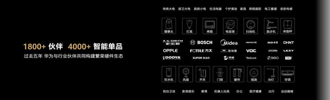 “N”代表子系统,细分为6个空间子系统和4个全屋子系统,其中,空间子系统包括照明、遮阳、影音、冷暖新风、家具家私、家电系统等,全屋子系统则包括网络、安全、用水、能耗等。过去5年间,华为已经与1800多个行业伙伴,合作了超过4000款智能单品,共同构建了硬件生态。