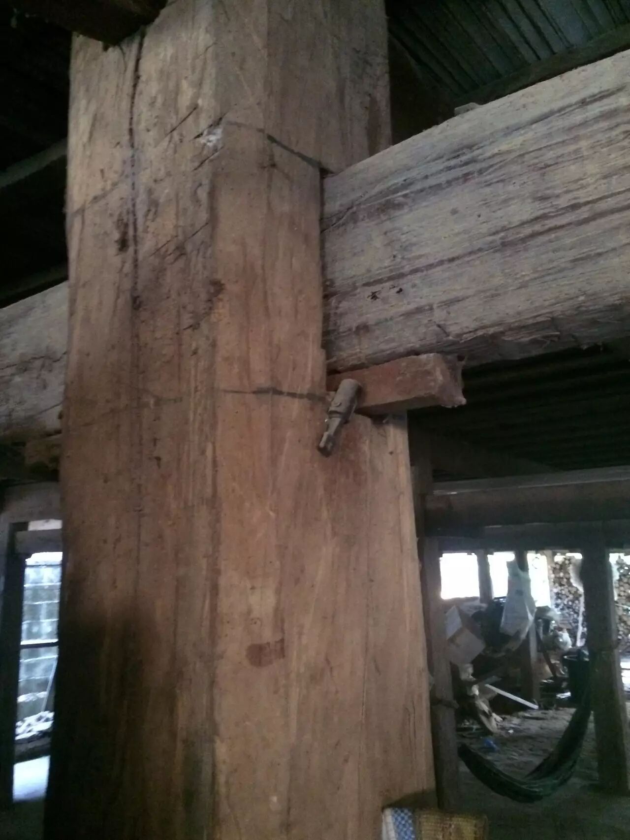 不觉间,玉骚已开始介绍她家一层的吊脚楼了,我便从自己愣怔的思绪中走出。她指着八角形的柱子和我们说,傣族的传统民居全为榫卯木质结构,抗震性较钢筋混凝土更强。这些柱子主体方形,四周被砍掉四个小角,是为了防蛇上房。要说蛇的身子再灵便,也只会爬圆形柱,而对于方形的,便招架不住了。