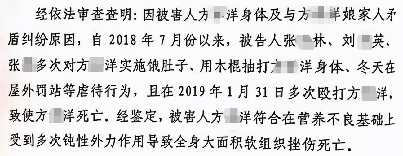 婚后,方某阳因为无法怀孕,多次遭到婆家虐待。施虐者,有方洋洋的公公婆婆,也有她的丈夫。施虐的手段:饿肚子、用木棍抽打身体,冬天在屋外罚站。2019年1月31日,方洋洋被多次殴打后死亡。
